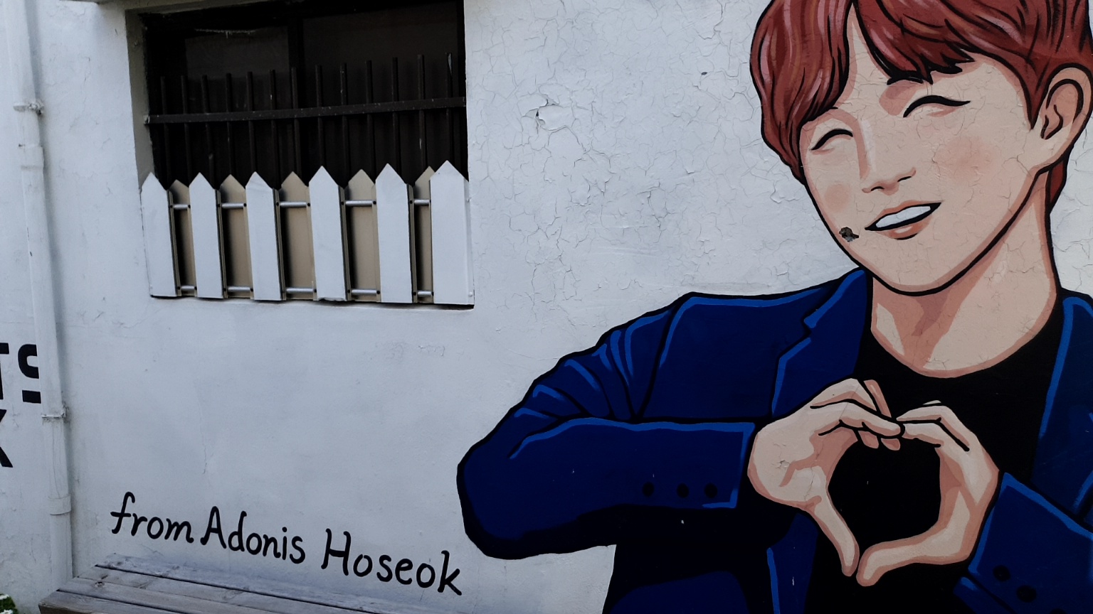 그리고 입구를 지나서 조금 더 들어가자마자 방탕소년단의 제이홉님의 그림이 그려져 있었습니다.