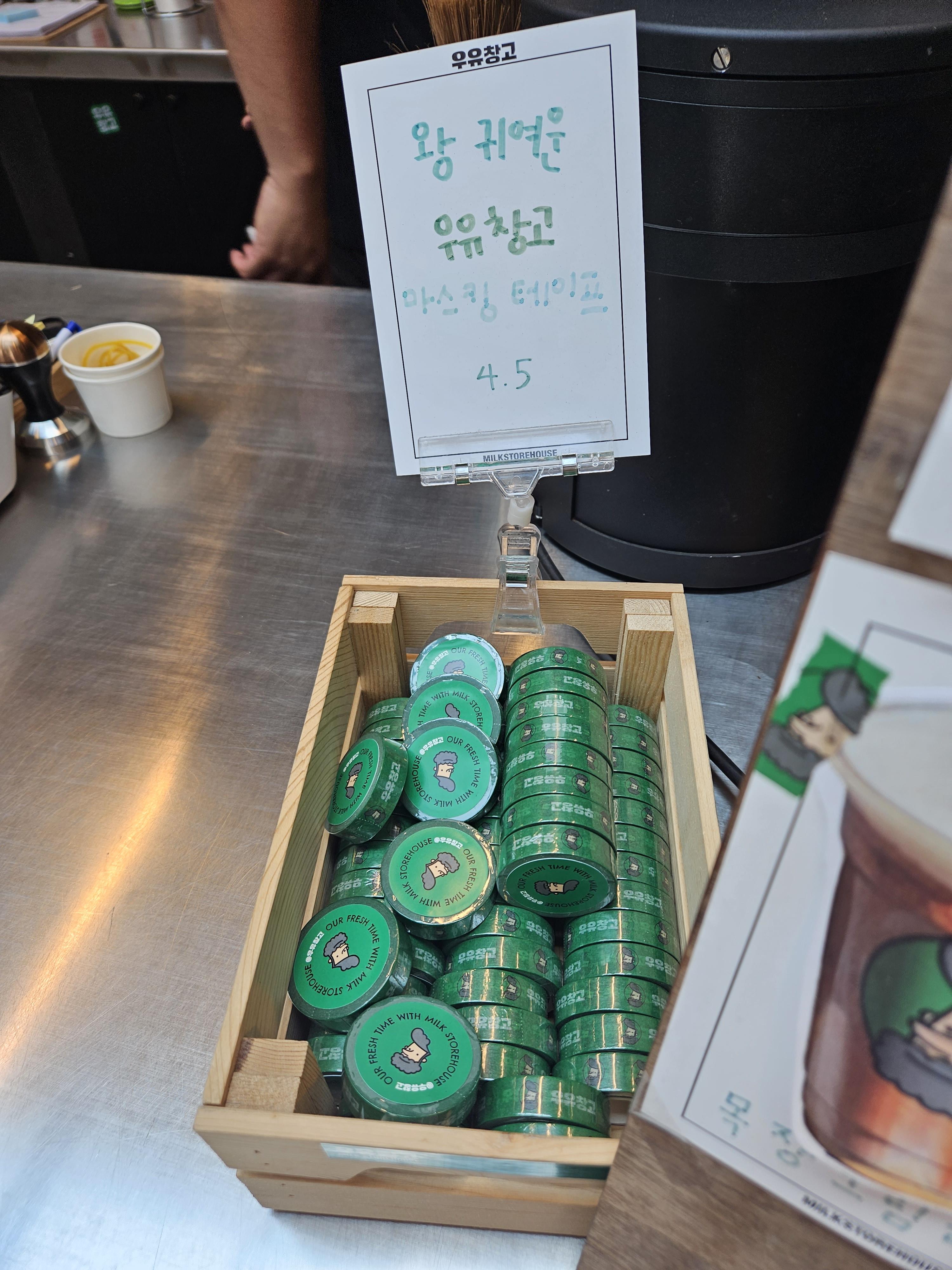 또한, 카운터 바로 옆에 우유창고 테이프를 판매하고 있었어요.